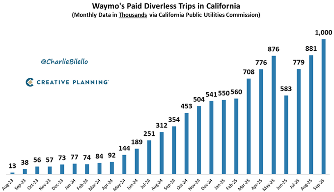 • Waymo has now hit the 1 million rides per month threshold I predicted it would last year, this year (and in California alone, no less). Link.
